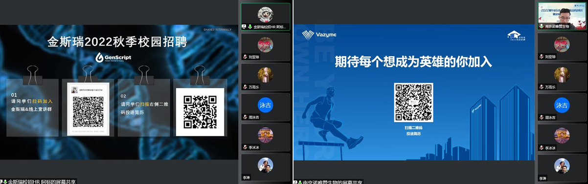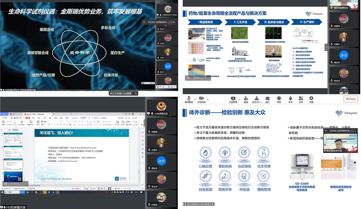 本次会议首先邀请南京诺唯赞、金斯瑞、南京迪飞医学等生物行业领先企业,分别从各自企业发展、企业现状、企业特色、人文关怀、当前企业岗位需求、应聘者求职方式、职工发展、职工待遇等多方位介绍了企业情况,期间公司2011届员工也在线分享了其在迪飞医学工作几年来的详尽历程与感受,并鼓励同学们主动投递简历、积极应聘,期待同学们能够在工作中进一步提升自己,找到人生价值。公司高建民老师又重点补充分享了上海生工、华兰生物、郑州科蒂亚生物技术有限公司、洛阳普莱柯生物工程股份有限公司、河南省嘉郁园林绿化工程有限公司等公司的简要情况及求职途径,并告知同学们不要有后顾之忧,相关企业均与公司存在长期产学研或实习实践合作关系。