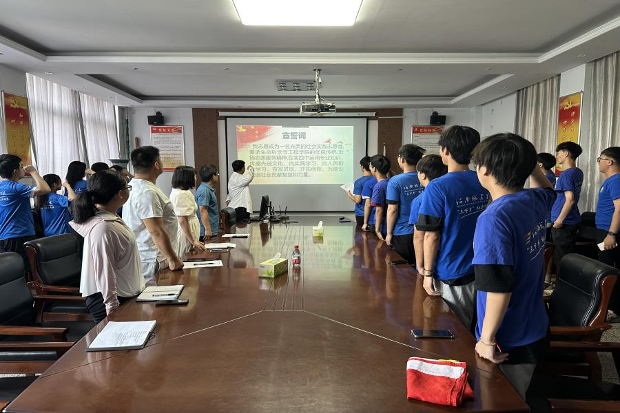 员工代表魏秀武带领志愿者进行宣誓,刘苹为暑期“三下乡”团队授旗。