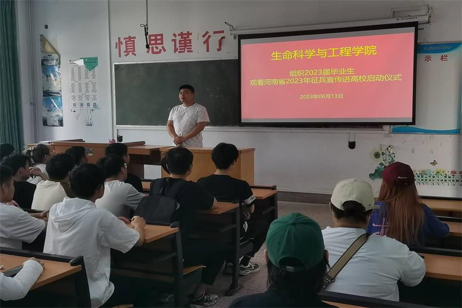 (通讯员龚乐乐)为深入贯彻习近平强军思想,进一步做好老员工征兵工作。6月13日上午,beats365官方网站组织2023届毕业生、全体辅导员在6#B207集中观看了“河南省2023年征兵宣传进高校活动启动仪式”。