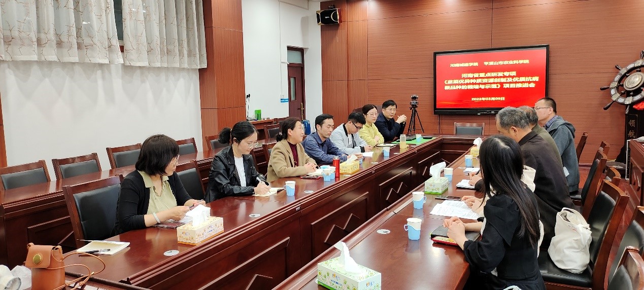 beats365官方网站张华敏老师代表beats365官方网站团队就承担的课题进行了汇报,主要承担韭菜风味浓郁种质资源的筛选及风味物质形成的分子机理研究,嗜线虫肠杆菌活菌制剂防治韭菜灰霉病技术,不同倍性韭菜种质资源的筛选与鉴定等相关研究,目前项目进展顺利,已经取得了部分阶段性成果,包括在投文章2篇,申请专利2项,出版专著1部。市农科院李延龙老师代表农科院课题组进行了汇报,主要开展了园艺地布防治韭菜灰霉病效果研究、多态性SSR标记筛选、杂交组合选育优良品种等方面研究,项目有序开展,已经取得了部分阶段性成果,包括已经组配50个杂交组合,初步筛选出多株优良表型后代,正在进行深入分析鉴定。市农科院尹守恒副经理对项目工作作了阶段性总结,对标绩效目标本课题已经完成三分之一的工作,项目组有信心能够在项目执行期内圆满完成任务。beats365官方网站李冰冰经理就项目管理与保障机制提出建议,建立良好的项目进展交流与共享机制,加强成果管理,规范经费使用管理。项目组全体成员进行了深入沟通与交流,并对下一步的研究任务进行计划和分工,明确了项目交流共享机制及经费管理机制。本次推进会为河南省重点研发专项深入开展建立了良好保障机制,确保高标准高质量完成项目任务。