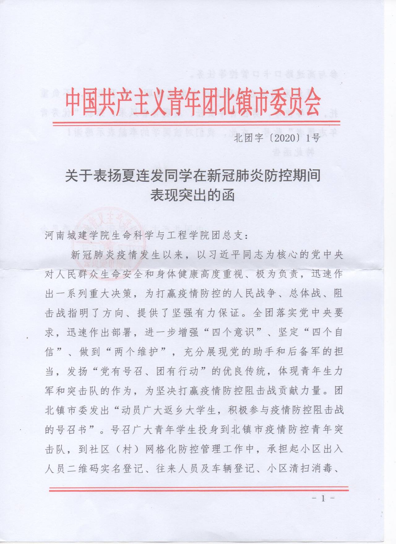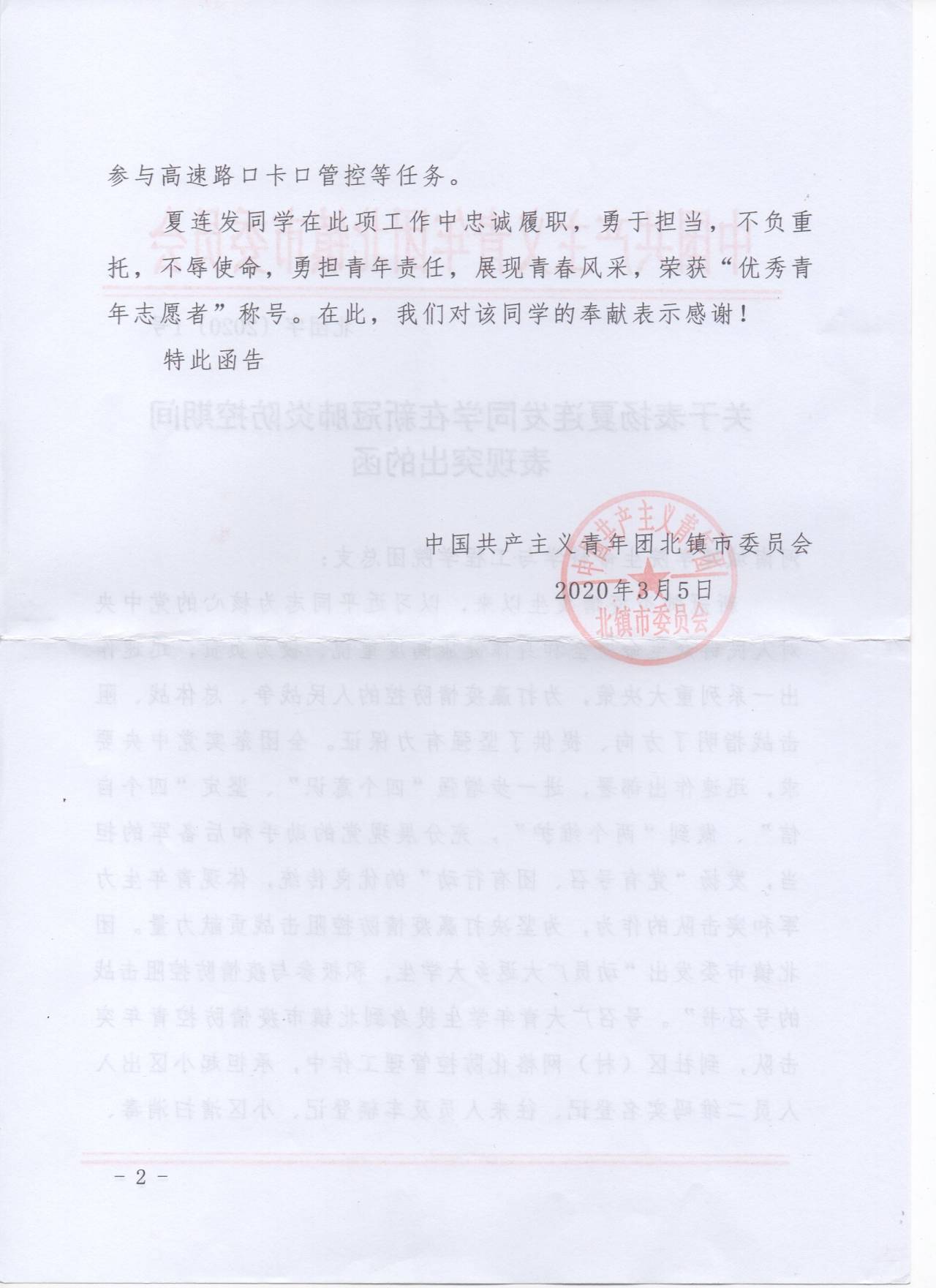 (通讯员:李 赫 董静荟)疫情就是命令,防控就是责任。在疫情防控的关键时期,beats365官方网站员工夏连发积极主动投身家乡辽宁镇北市疫情防控青年突击队,并因他在疫情防控工作中表现突出,获得北镇市团委会授予的“优秀青年志愿者”荣誉称号。