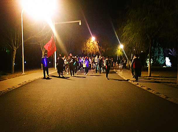 26日晚六点半一百多名志愿者在南门集合,在组织者的带领下来到平西湖公园,夜幕降临,志愿者们开始了“荧光夜跑”活动。志愿者们手持大型荧光棒,排着排着的队伍,其中还有脚踏轮滑鞋的同学们,奔跑在平西湖公园的环湖道路上。本次活动受到了广大市民的一致好评,许多在平西湖公园游玩的市民见到后都纷纷积极加入“夜跑”队伍之中。