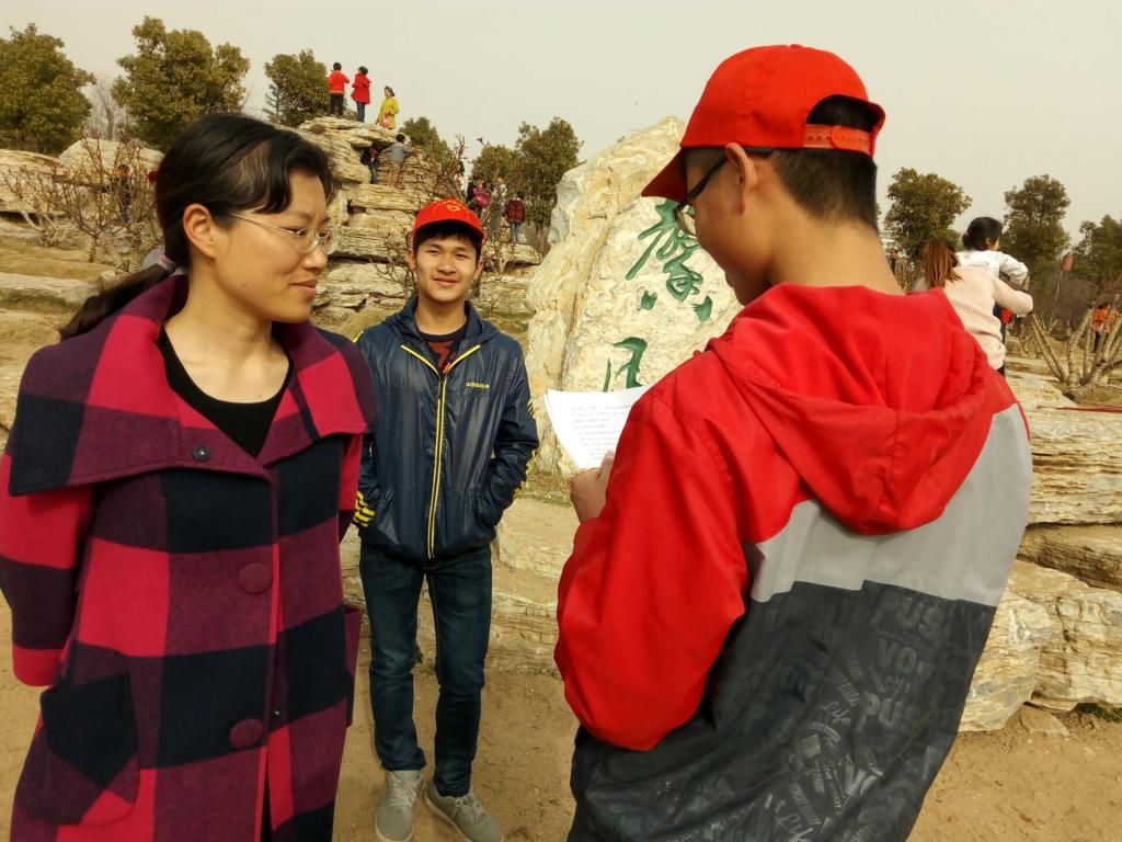 志愿者们于西门出发,因为人数较多,并不选择前往人流密集的市区,而是步行来到了平西湖公园。大家手持小国旗,头戴小红帽,高举青协的旗帜和写有“弘扬雷锋精神,参与志愿服务”的条幅。伴随着《学习雷锋好榜样》的音乐,排列着整齐的队伍。这一形象吸引了在公园漫步的众人好奇的眼光。有了这一良好的开场,志愿者们便选取人流最密集的公园中心开始挂拉条幅,不时便有多人前来看热闹。志愿者们毫不怯场的口述雷锋事迹与雷锋精神,更是分成若干小组向在场群众进行采访,并向路人发放小国旗作为感谢。本次活动中,我们了解到人们对于雷锋精神的认识,群众们也积极得表示将会继续学习雷锋精神,积极投入到志愿服务中来。