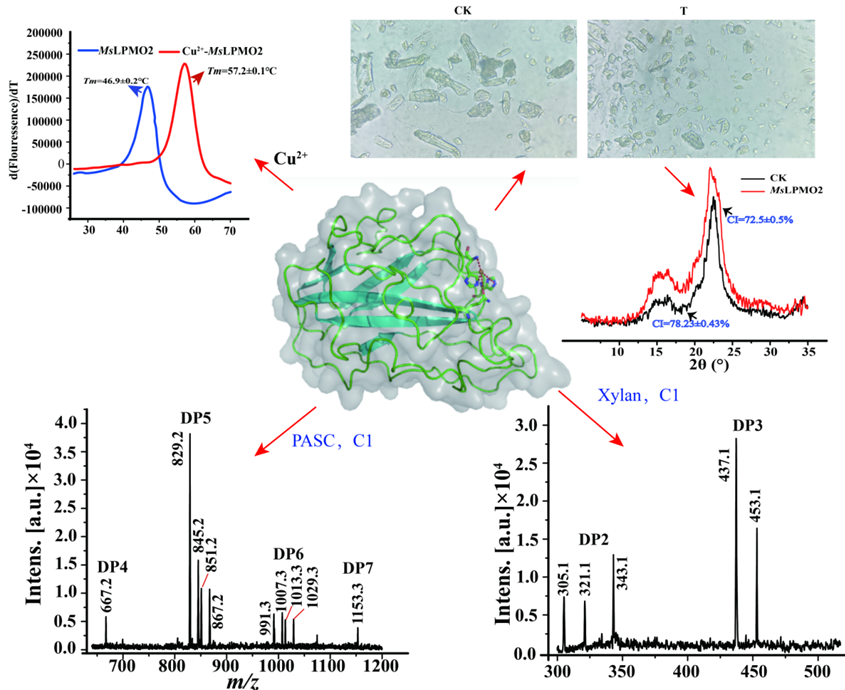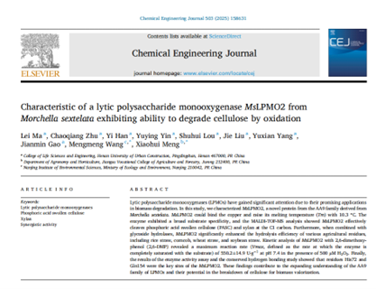 相关研究成果以“Characteristic of a lytic polysaccharide monooxygenase MsLPMO2 from Morchella sextelata exhibiting ability to degrade cellulose by oxidation为题,在线发表于国际知名学术期刊《Chemical Engineering Journal》(中科院Top期刊,IF=13.3),beats365官方网站为第一单位,beats365官方网站马磊博士为第一作者,高建民博士和公司本科生朱超强、韩艺、尹玉莹、娄淑慧、杨玉贤参与了研究。