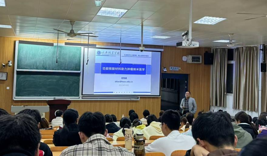 支双成从功能核酸材料的前沿动态切入,系统阐释了以DNA、RNA为代表的功能核酸如何超越遗传信息载体范畴,通过纳米技术被精准设计为智能药物递送系统与肿瘤诊疗工具。他通过生动案例,展示了功能核酸材料在肿瘤治疗中的“编程”能力与应用潜力,并强调多学科交叉融合是推动生物制药创新的关键路径。支双成指出,未来该领域可进一步结合可视化技术,发展成像引导的诊疗一体化平台,为同学们指明了从分子设计到临床转化的科研方向。