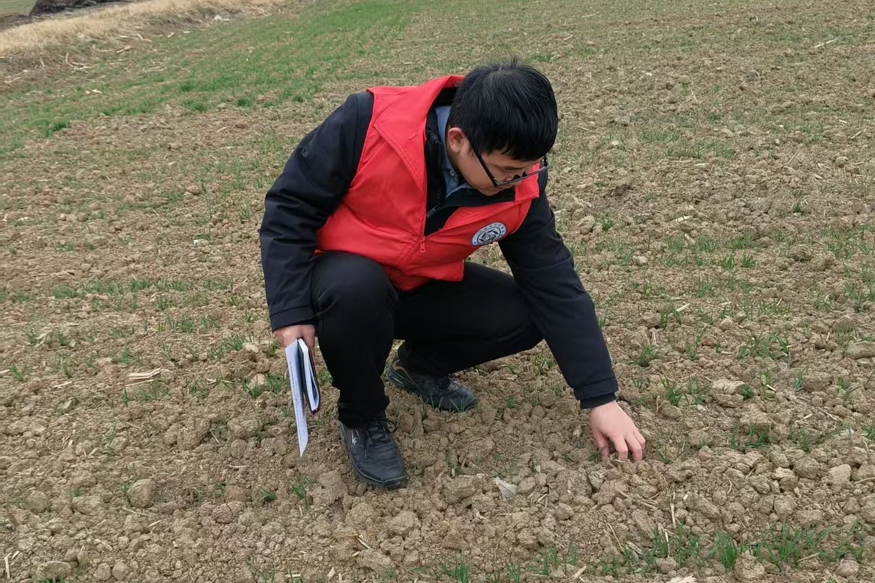 朱玉涛博士仔细查看小麦苗情、土壤墒情及田间管理情况,与种植户深入交流,详细了解他们当前生产中遇到的问题与担忧。针对即将到来的低温雨雪天气,他结合当地实际提出四项可操作的技术建议:一是对播种较晚、根系发育不足的地块,适时适量增施暖性肥,增强小麦保温抗寒能力;二是降温前根据条件喷施叶面肥或抗寒调节剂,提升植株自身抵抗力;三是对前期整地粗放、长势偏旺的麦田,及时镇压保墒;四是天气转晴后,巡查冻害情况,科学评估并分类追肥,促进小麦恢复生长。