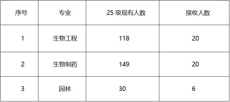 结合公司各专业人才培养要求与教学实际,公司拟接收生物工程、生物制药、园林3个本科专业。具体各专业接收人数: