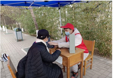志愿者们为老人测血压